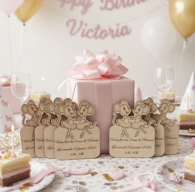 Le FAIRE PART Souris est une magnifique invitation d'anniversaire en bois de bouleau qui émerveillera vos proches. Avec son design original et sa finition soignée, il ajoutera une touche rustique et naturelle.