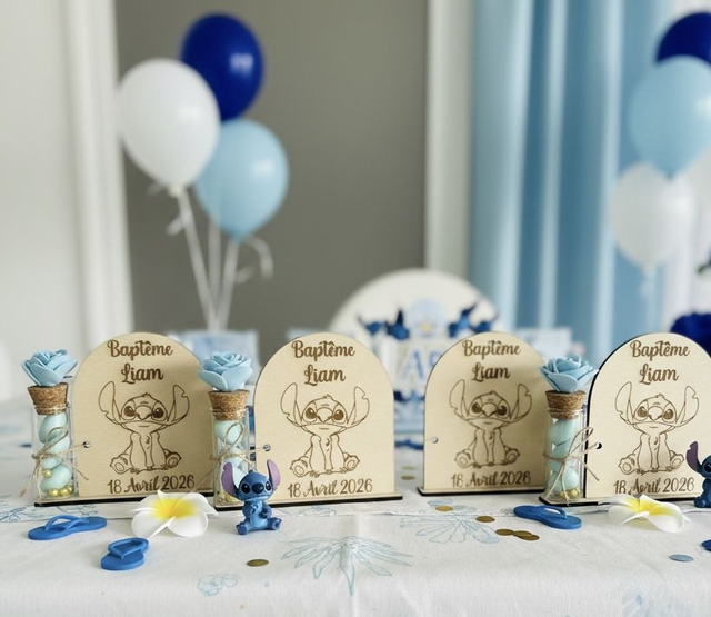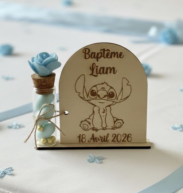 Joli support en bois gravé avec Stitch + texte + fiole en verre